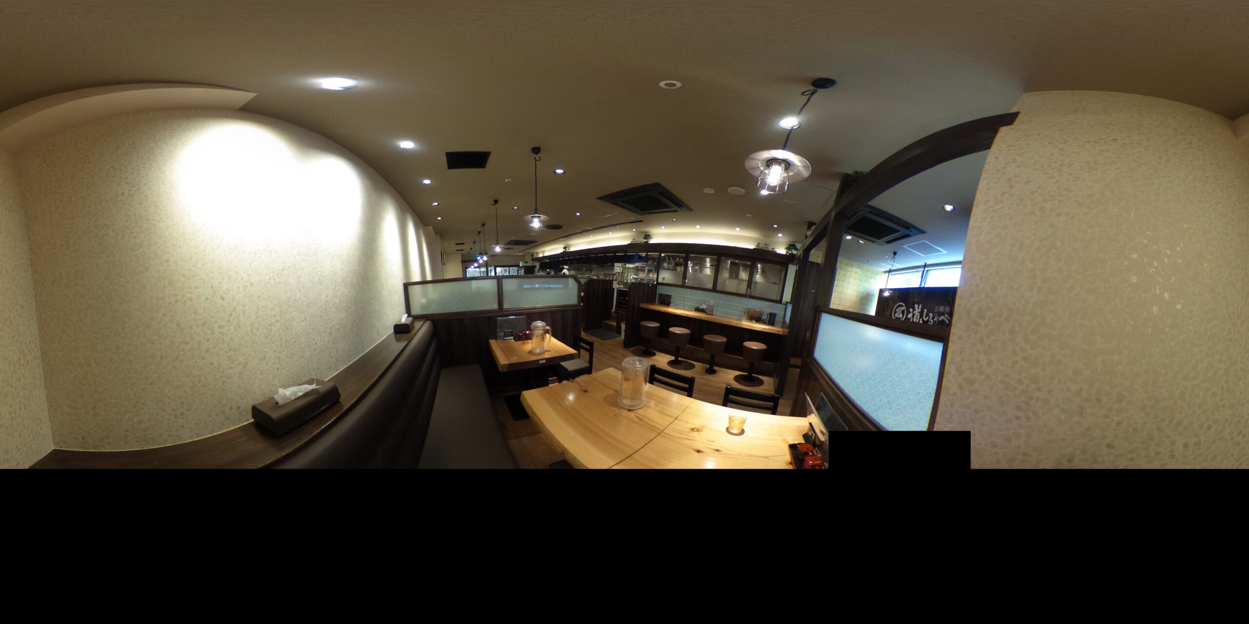 厨房側に横一列でカウンター席に、テーブル席が奥に向かって並べられています。