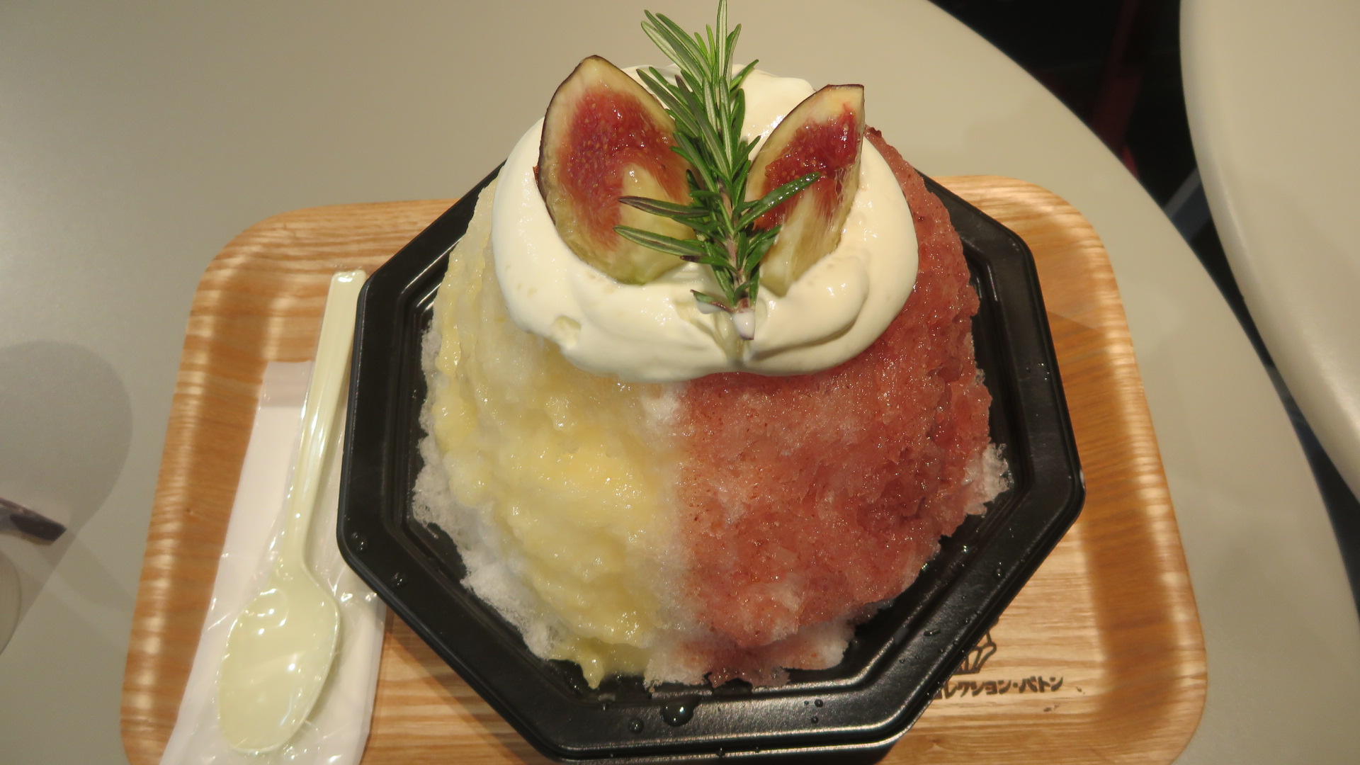 前半メニューより、にしのみや果汁店のかき氷、桃イチジクみるく。