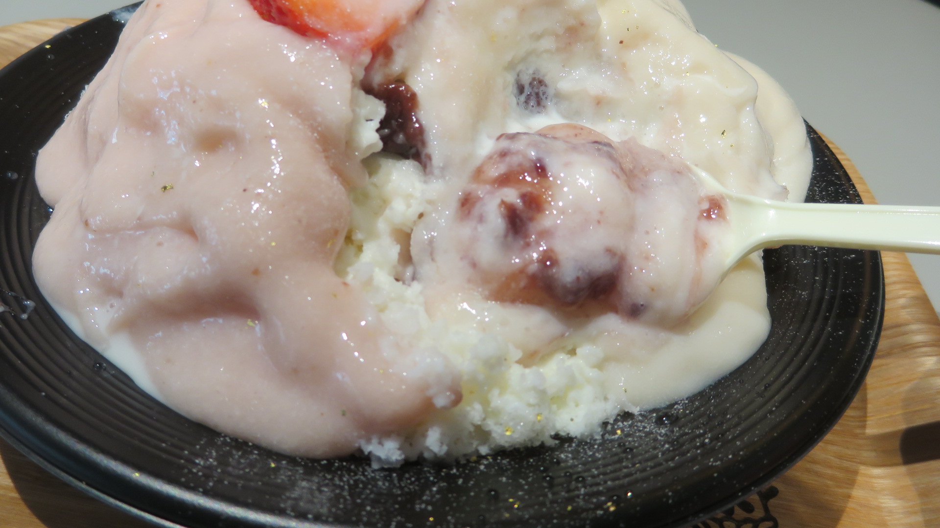 紅白の正月らしいかき氷ですが、酒粕を使ったクリームがかけられているので、これが結構アルコール感が強めです。