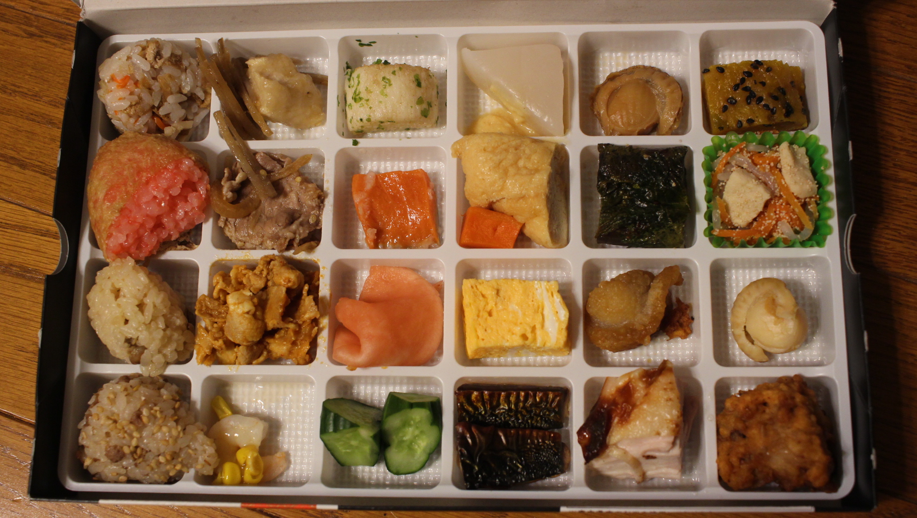 開けると、ひとくちサイズのおかずとおにぎりがいろいろ。宝石箱のようです。