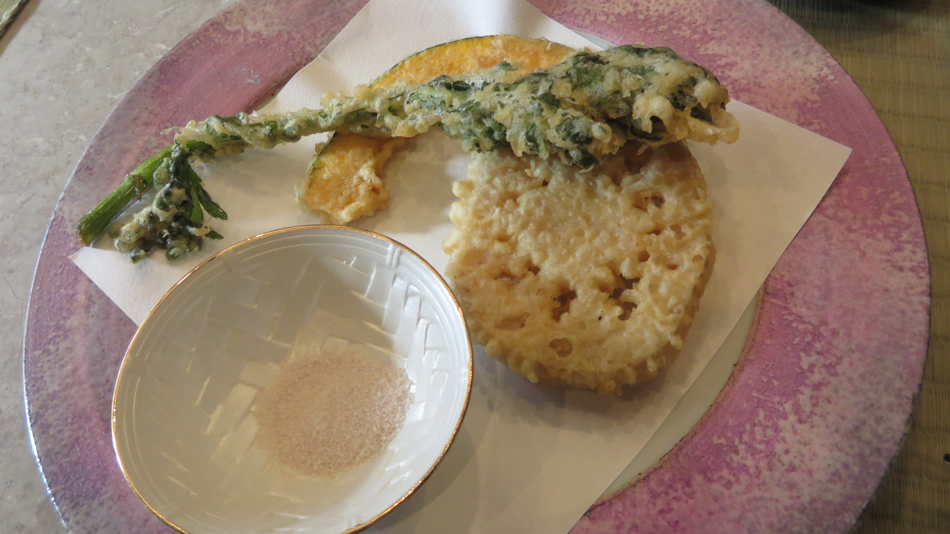 注文したのは、春菊、れんこん、かぼちゃのてんぷら。塩と、お蕎麦のそばつゆでいただきました。てんぷらは、もうひとつかな、といった感じ。