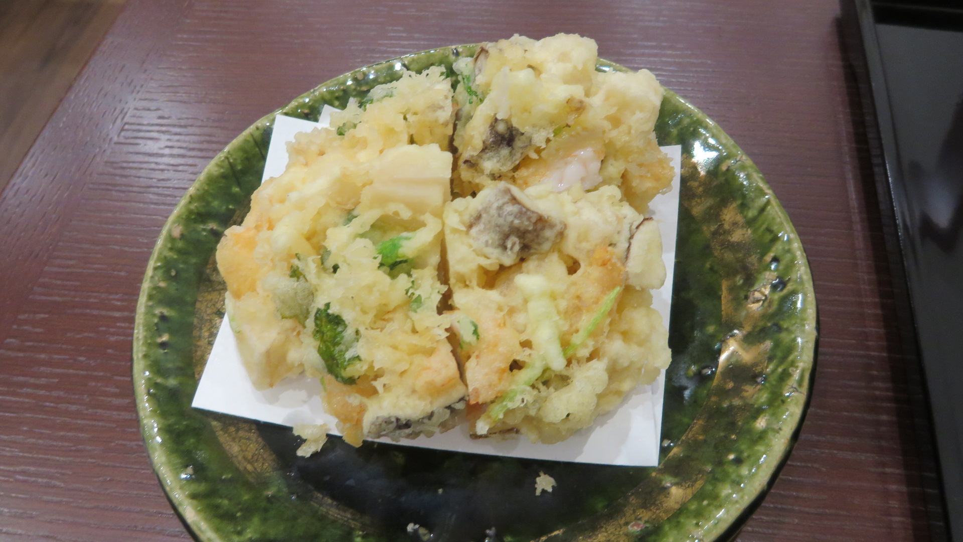 サクサクっとした揚げたててんぷら。お塩と天つゆでいただきます。おいしい。