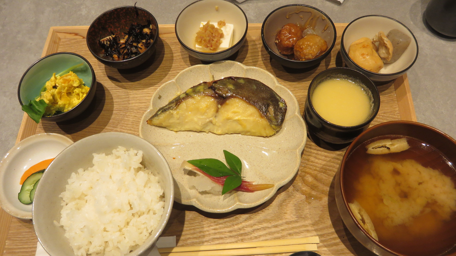 副菜は、5種類で食べ放題。それに、茶碗蒸しはひとつだけと、お味噌汁。そして、メイン料理は、あとからやってくる、というスタイルです。