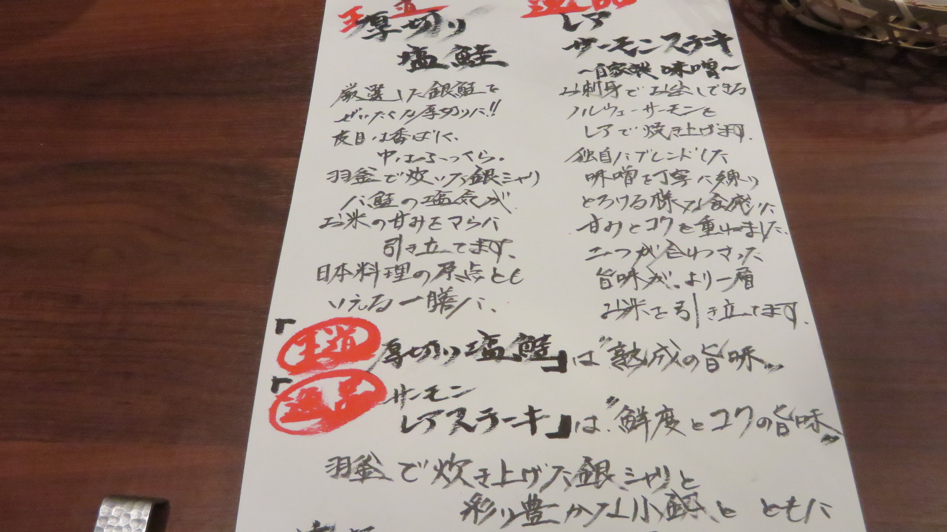 ランチメニューは、シャケ定食が2種類。ともに、2500円也。