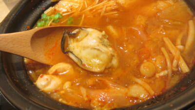 最近、トッピングに牡蠣が追加されたので、それに合うという旨辛きりたんぽ鍋をいただきました。